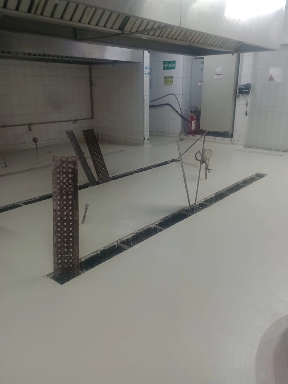 Sistema: pintura epóxi ou autonivelante uretano (dependendo da demanda). Espessura: 0,3 micras (pintura) e de 3 a 6 mm (uretano autonivelante). Resistência térmica: até 60 °C no epóxi | até 120 °C contínuo no uretano (com choque térmico até 150 °C). Resistência química: óleos, gorduras, detergentes, desinfetantes e agentes de limpeza agressivos. Acabamento: antiderrapante, fosco ou brilhante, sem juntas aparentes. Higienização: fácil lavagem, não acumula sujeira e impede infiltração de líquidos. Serve para proteger e revestir o piso de cozinhas industriais, garantindo resistência mecânica, química e térmica, além de atender normas sanitárias (ANVISA, MAPA), oferecendo segurança, facilidade de limpeza e durabilidade em áreas de preparo de alimentos. Cumpre normas sanitárias e facilita aprovação em auditorias. Resistência contra impactos, variações de temperatura e produtos de limpeza. Superfície contínua, sem juntas → evita acúmulo de sujeira e proliferação de bactérias. Pode ser antiderrapante, aumentando a segurança dos colaboradores. Excelente custo-benefício em relação a cerâmicas e pisos convencionais, com menor manutenção.